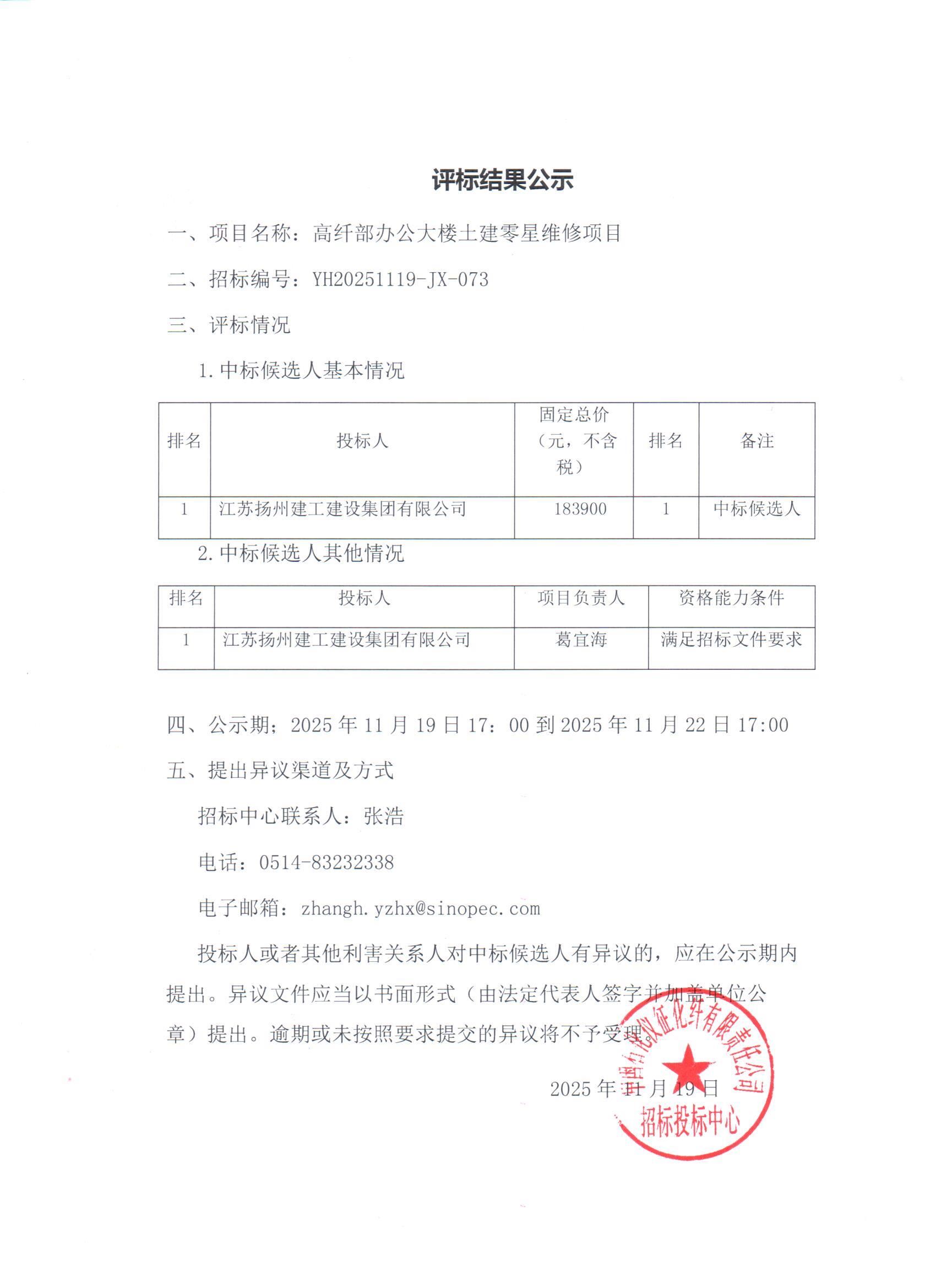 评标结果公示(仪征化纤高纤部办公大楼土建零星维修)