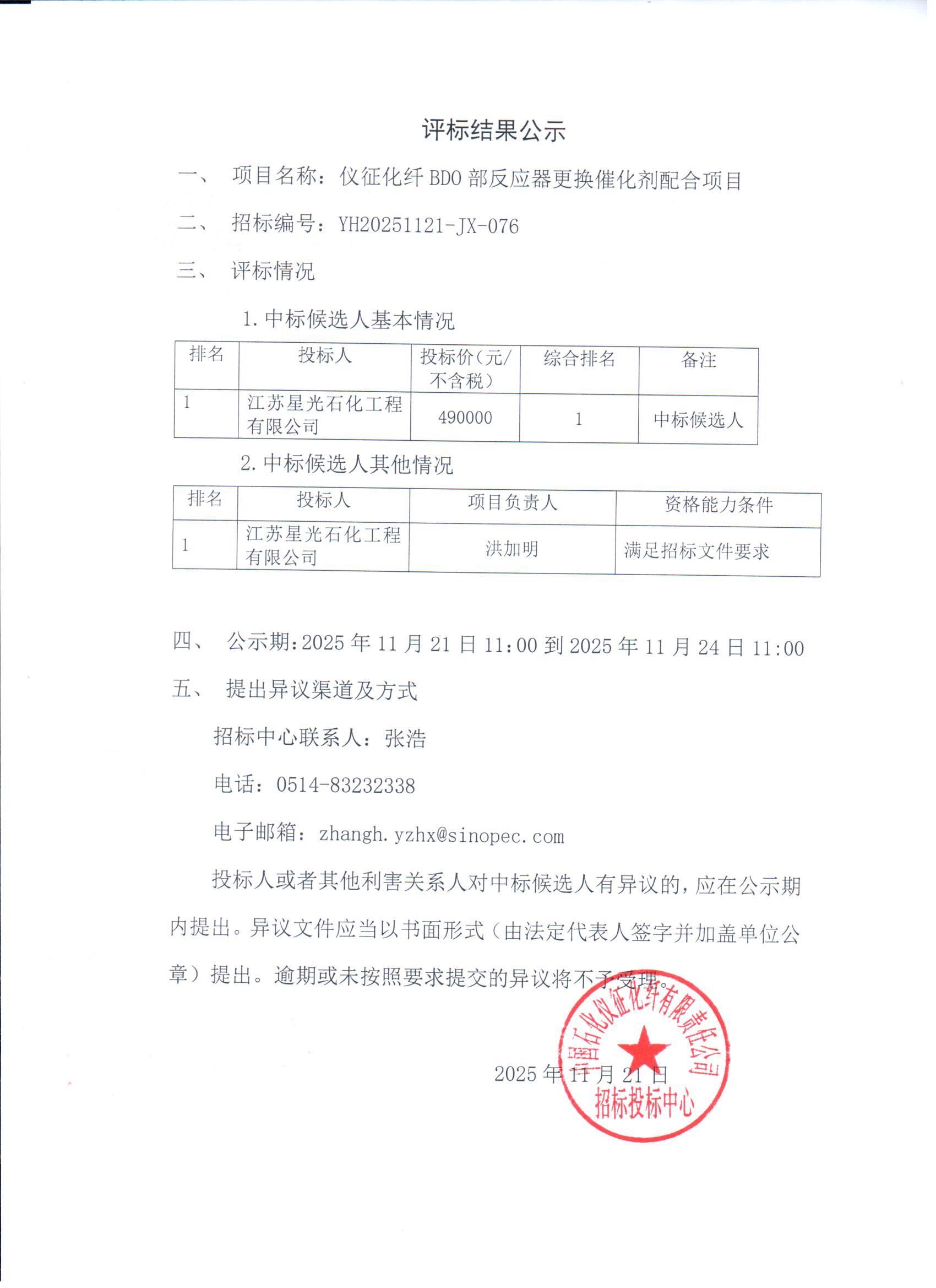 评标结果公示(仪征化纤BDO部反应器更换催化剂配合项目)
