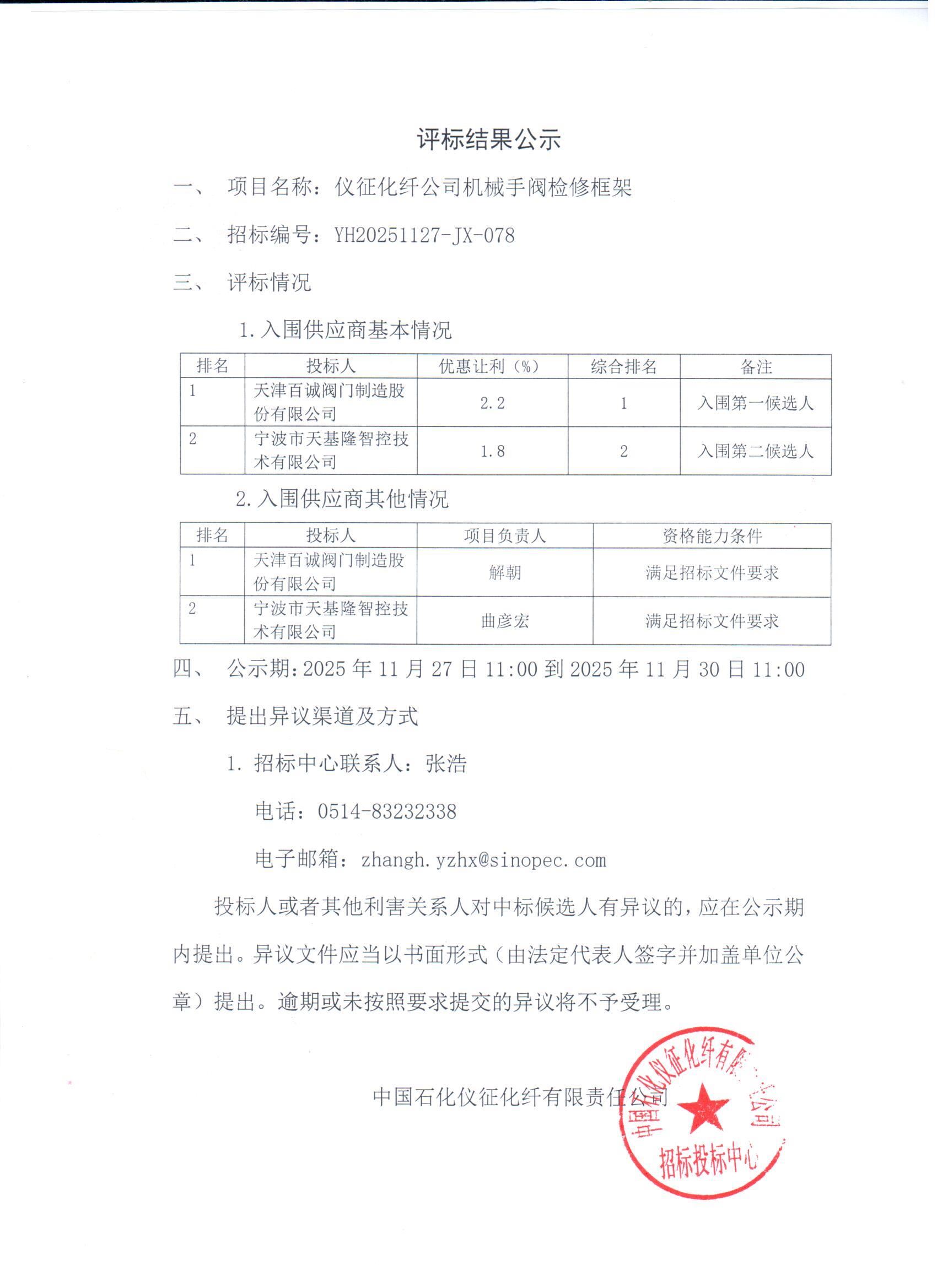评标结果公示(仪征化纤公司机械手阀检修框架)
