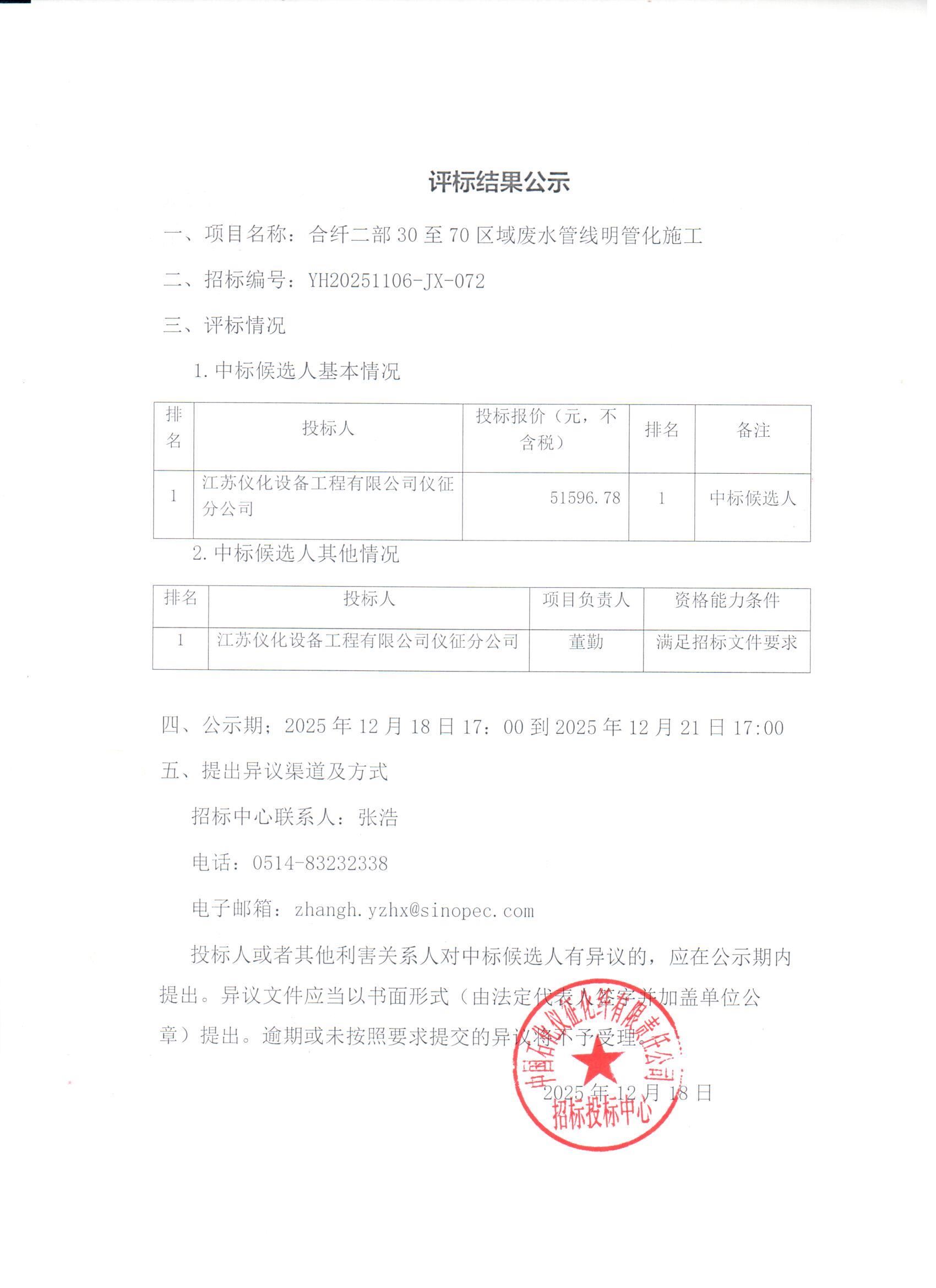 评标结果公示(仪征化纤合纤二部30至70区域废水管线明管化施工项目)