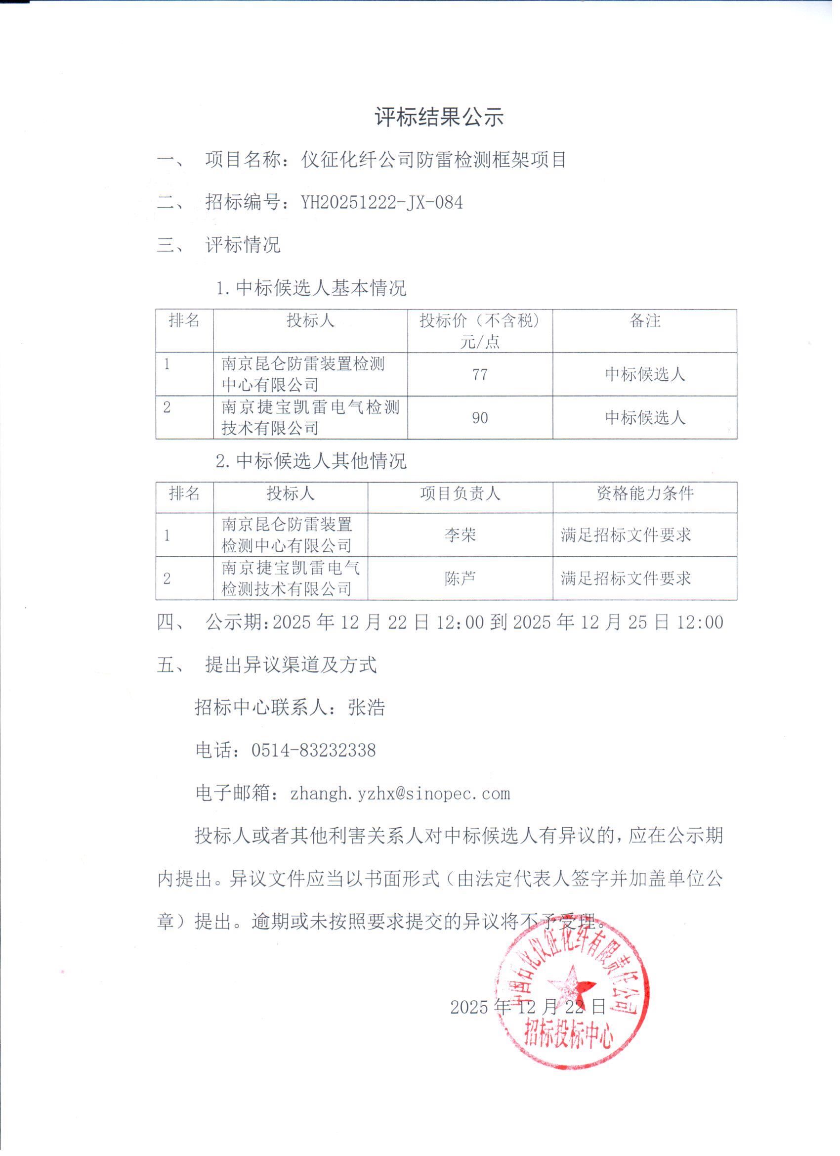 评标结果公示(仪征化纤公司防雷检测框架项目)