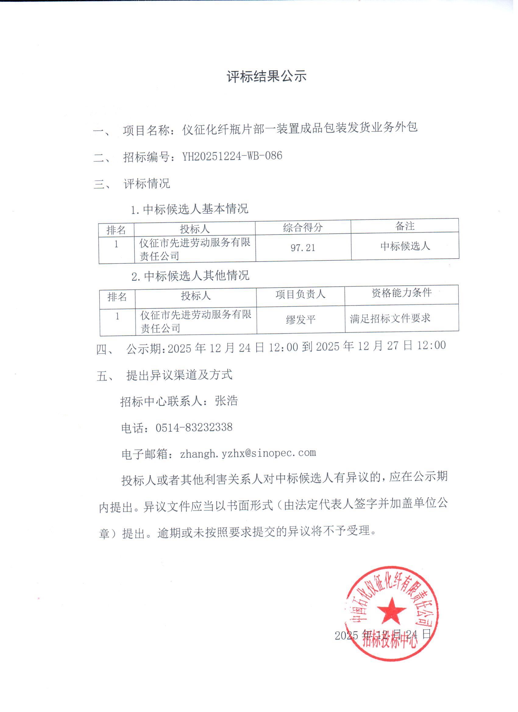 评标结果公示(仪征化纤瓶片部一装置成品包装发货业务外包)