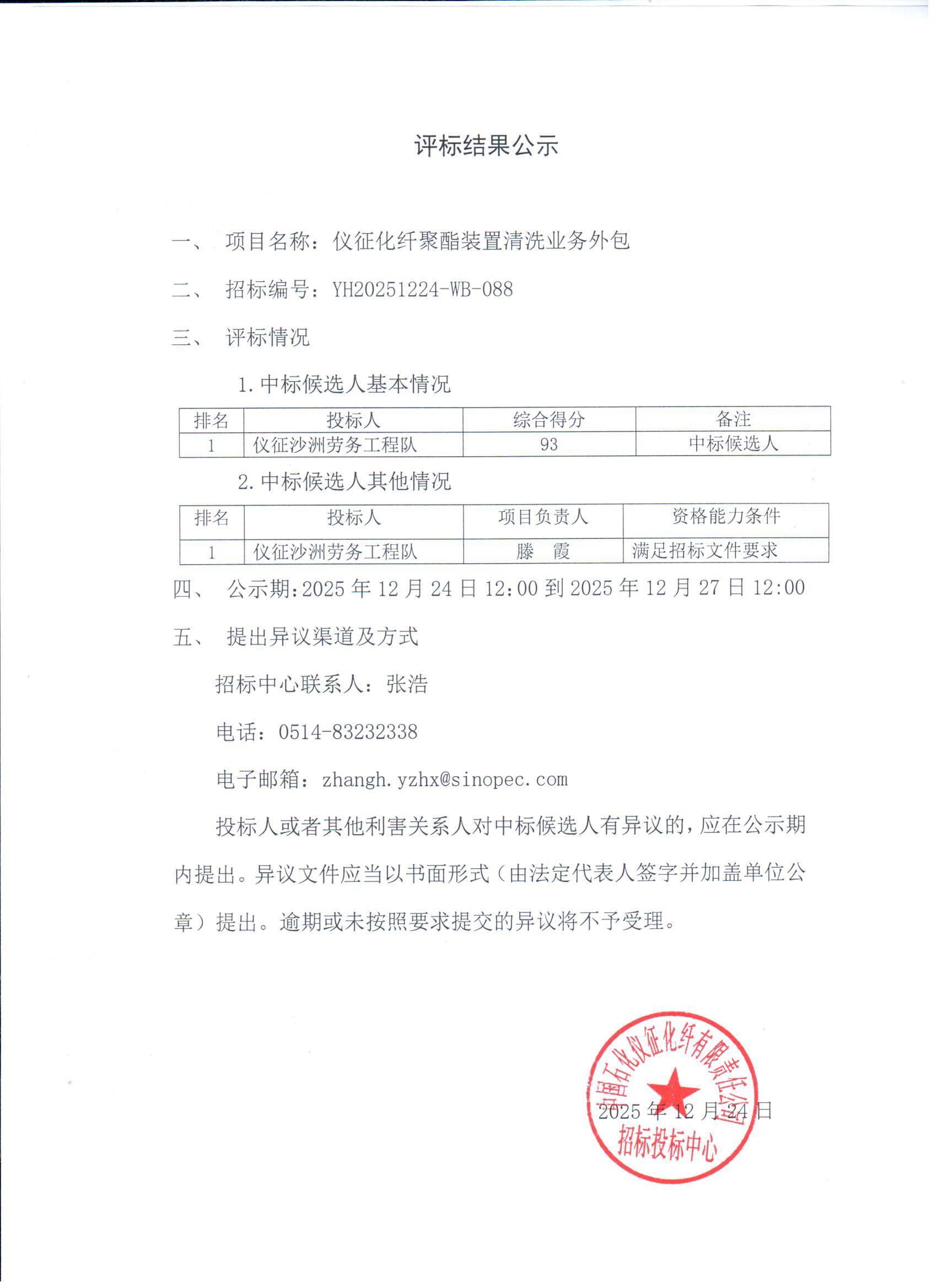 评标结果公示(仪征化纤聚酯装置清洗业务外包)