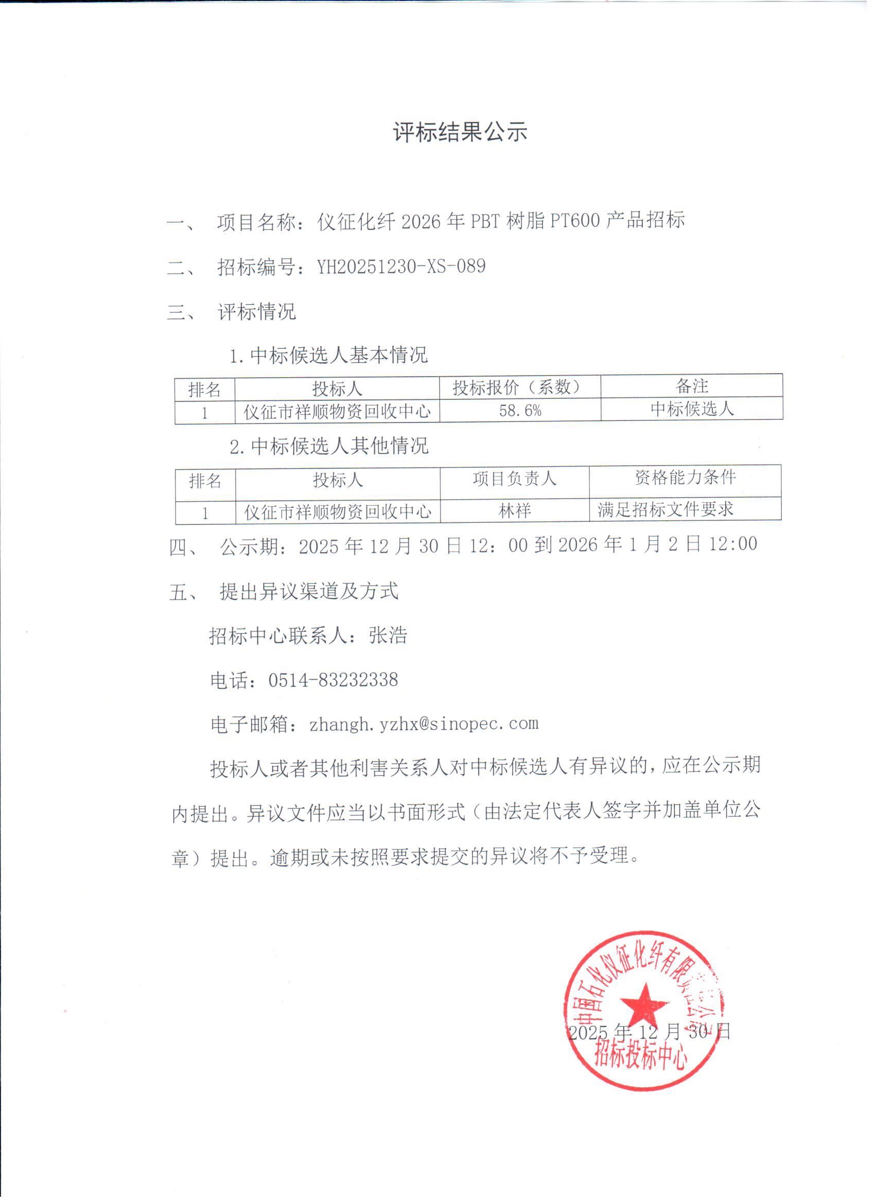 评标结果公示(仪征化纤2026年PBT树脂PT600产品招标)