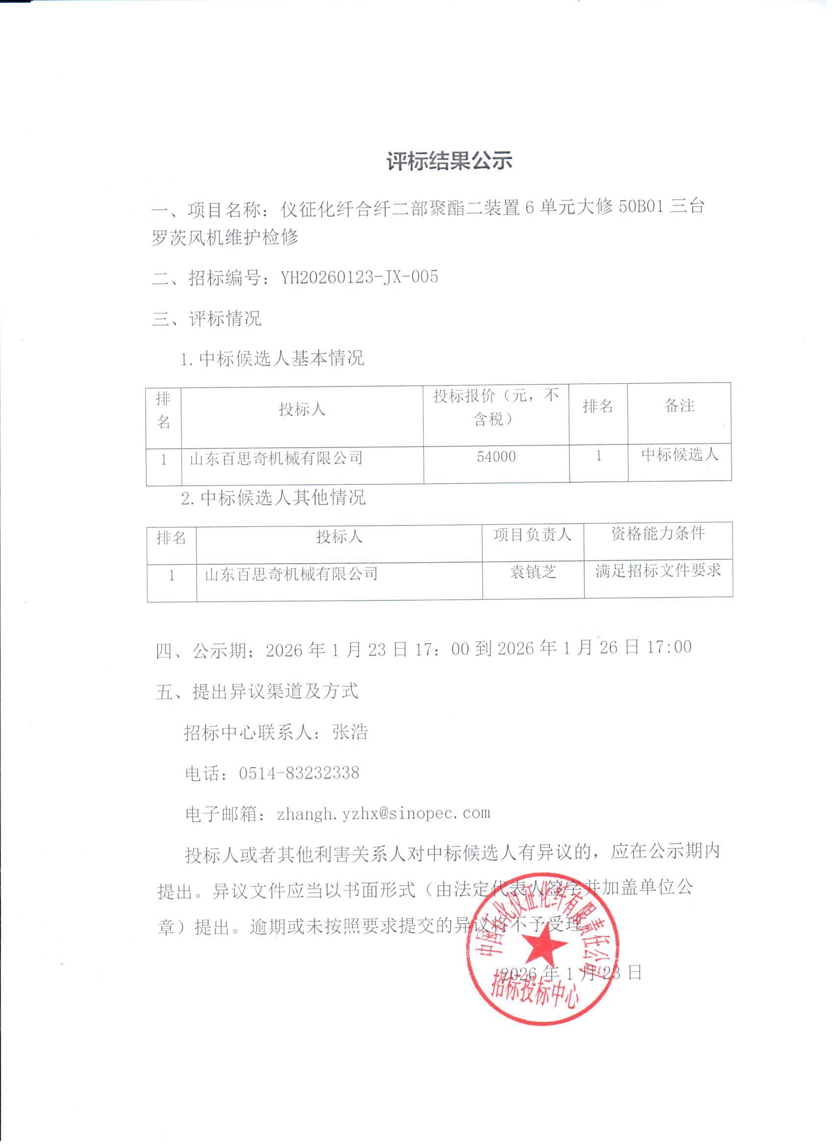 评标结果公示(仪征化纤合纤二部聚酯二装置6单元大修50B01三台罗茨风机维护检修)