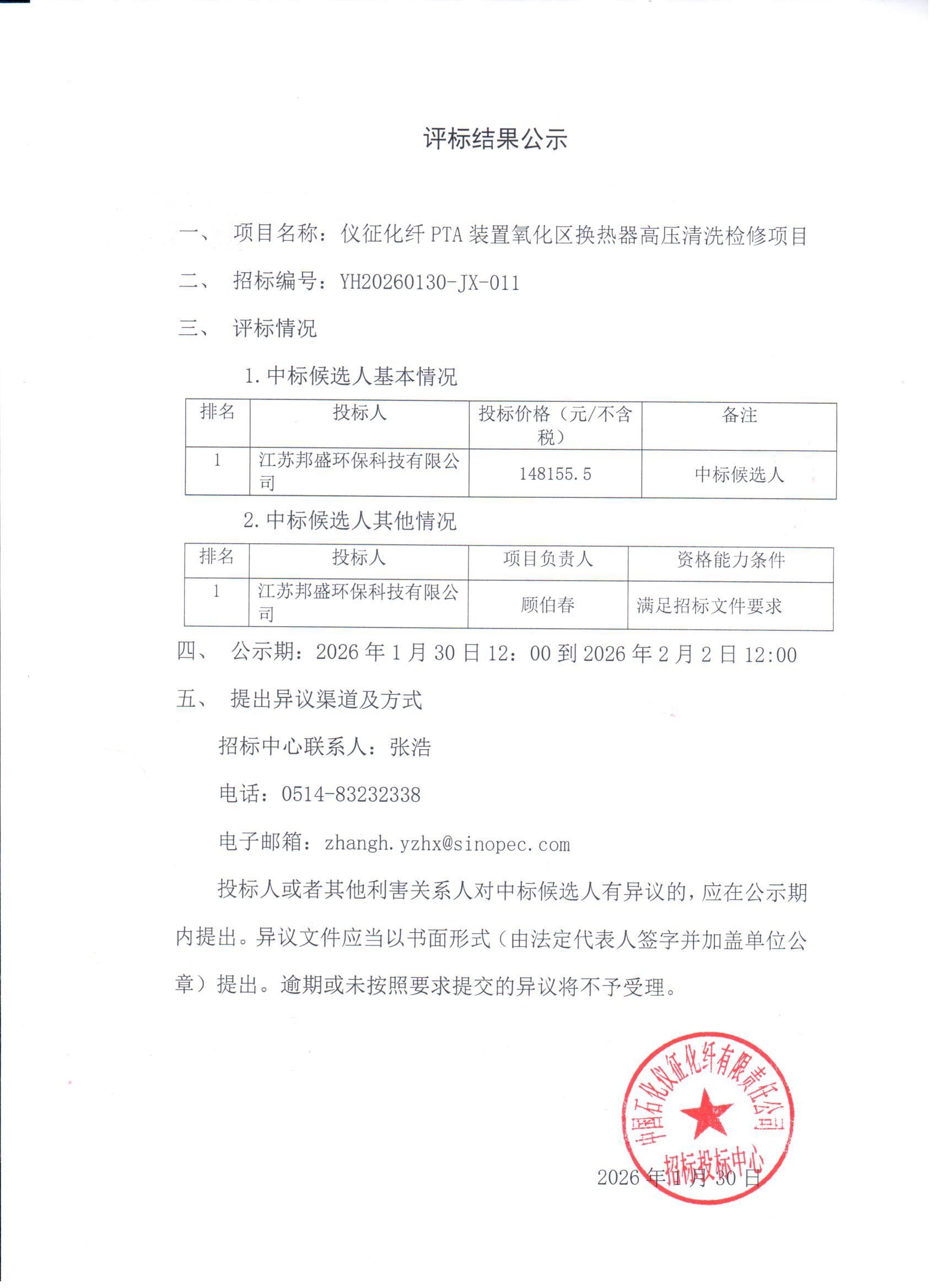 评标结果公示(仪征化纤PTA装置氧化区换热器高压清洗检修项目)