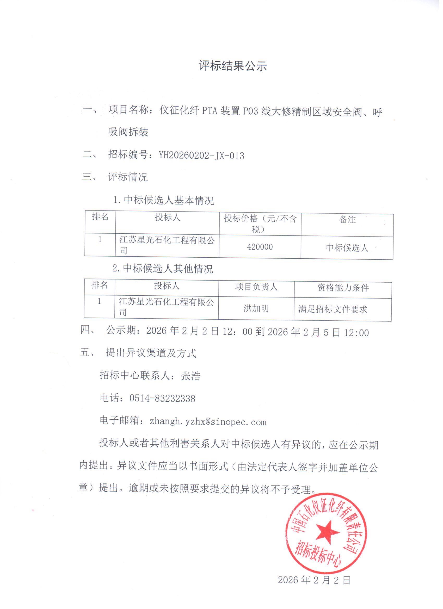评标结果公示(仪征化纤PTA装置P03线大修精制区域安全阀、呼吸阀拆装)