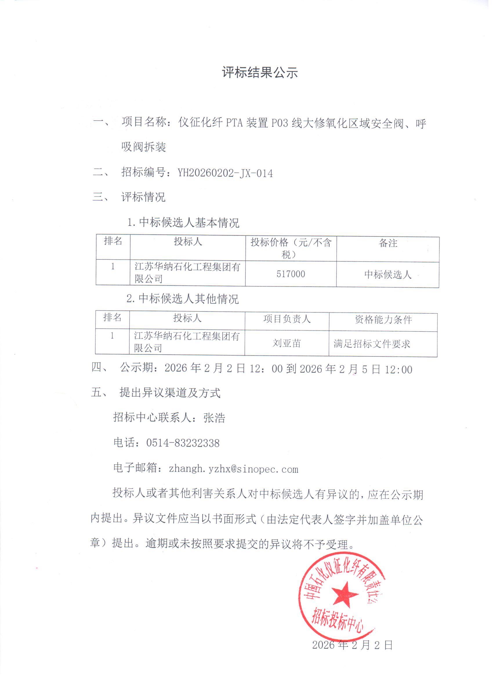 评标结果公示(仪征化纤PTA装置P03线大修氧化区域安全阀、呼吸阀拆装)