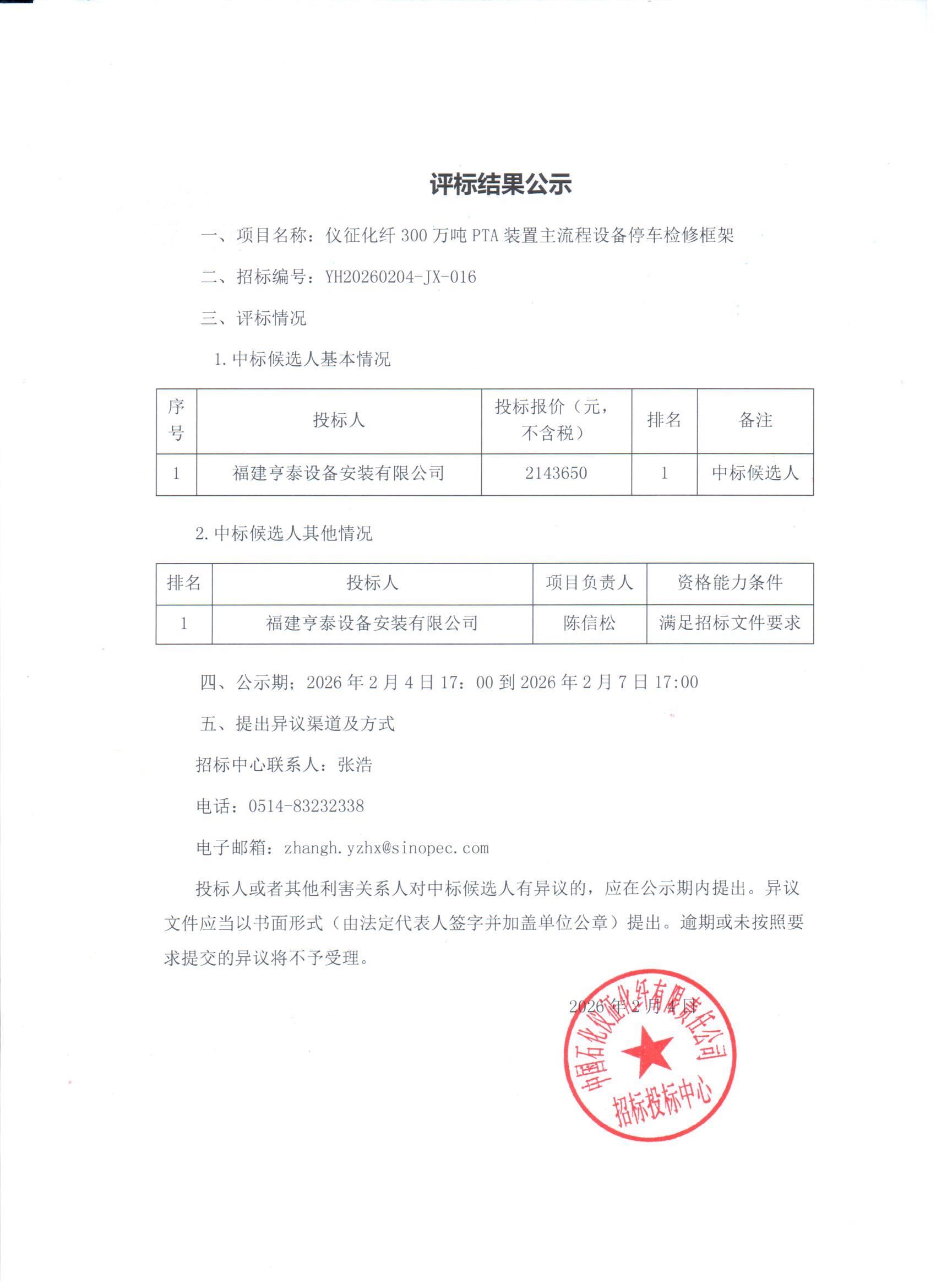 评标结果公示(仪征化纤300万吨PTA装置主流程设备停车检修框架)