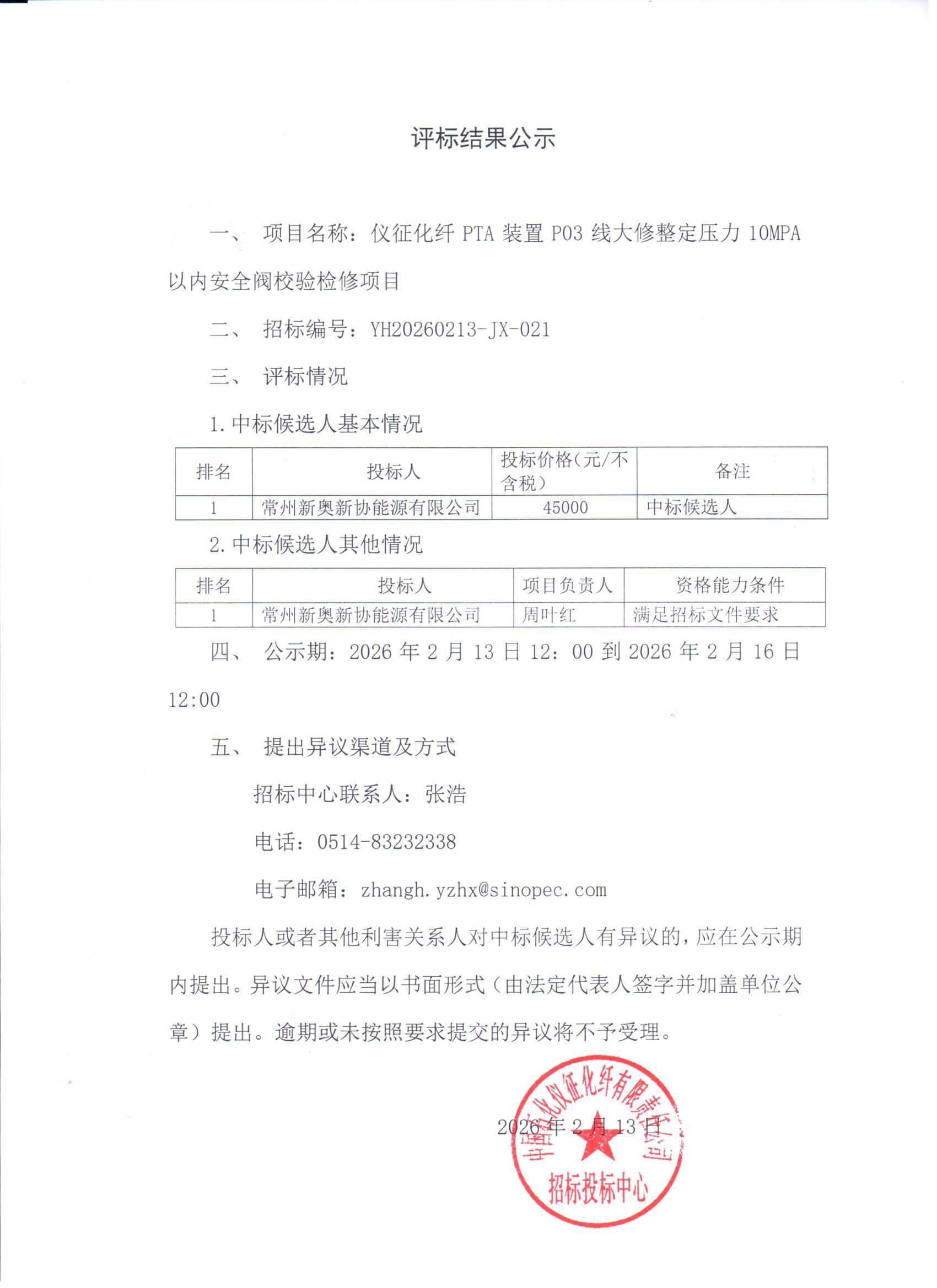 评标结果公示(仪征化纤PTA装置P03线大修整定压力10MPA以内安全阀校验检修(重招))