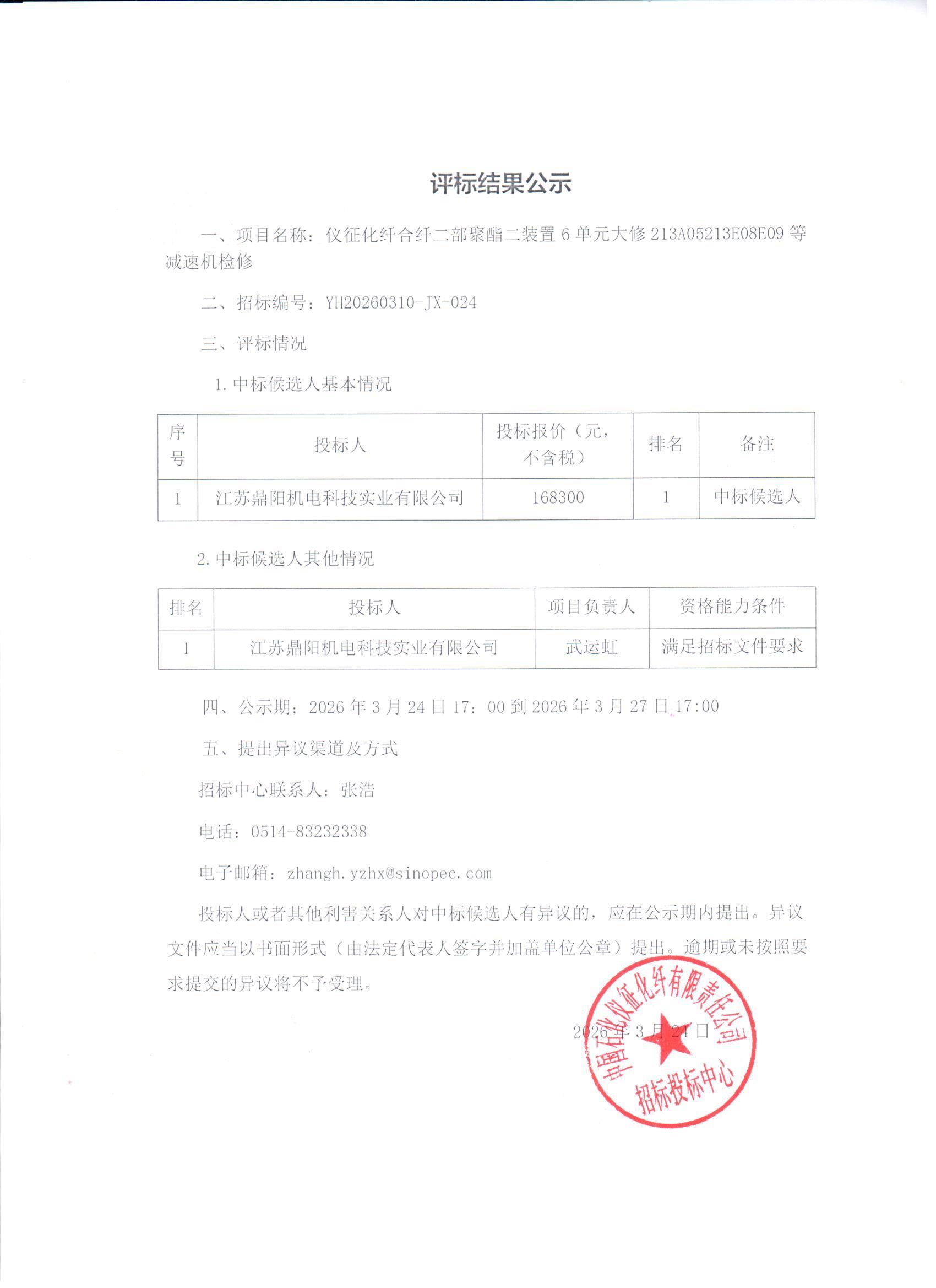 评标结果公示(仪征化纤合纤二部聚酯二装置6单元大修213A05213E08E09等减速机检修)