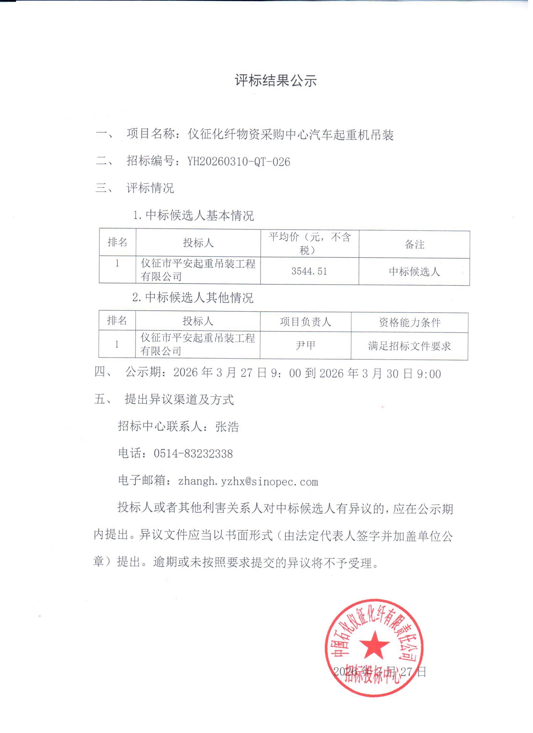评标结果公示(仪征化纤物资采购中心汽车起重机吊装)