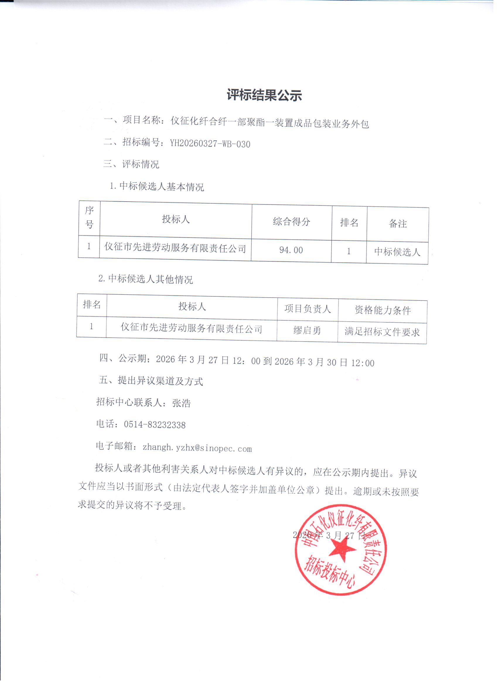 评标结果公示(仪征化纤合纤一部聚酯一装置成品包装业务外包)