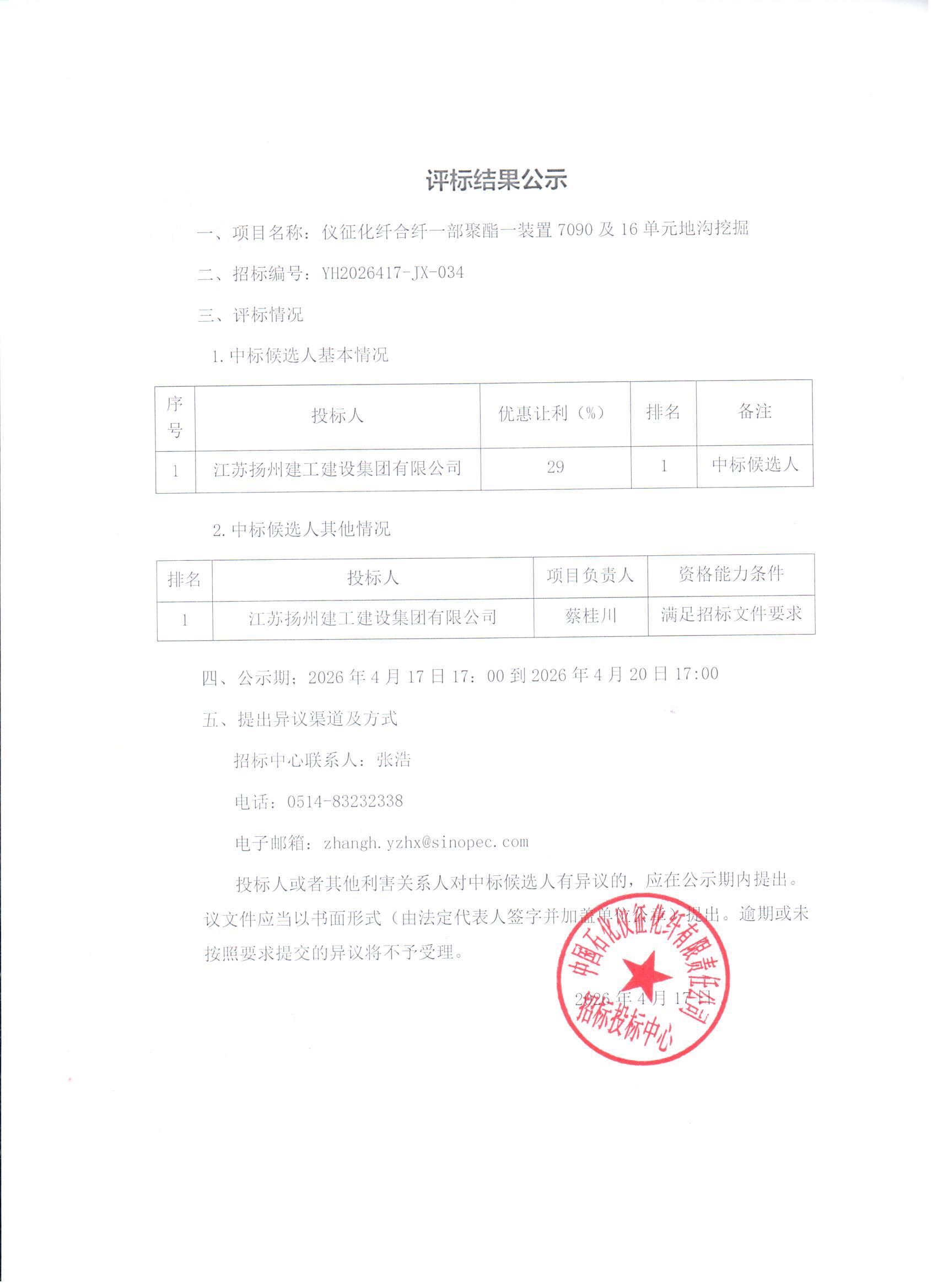 评标结果公示(仪征化纤合纤一部聚酯一装置7090及16单元地沟挖掘)
